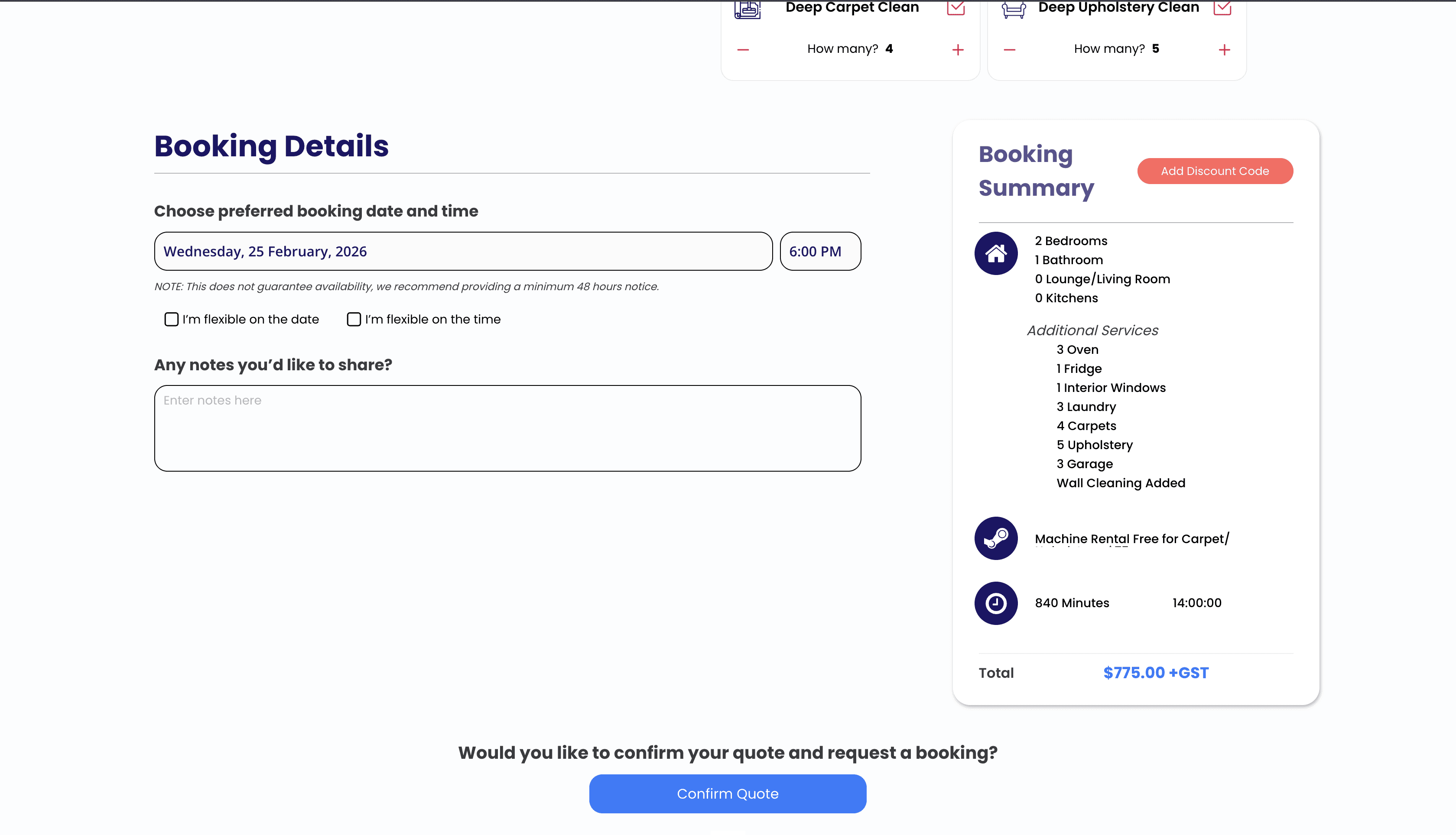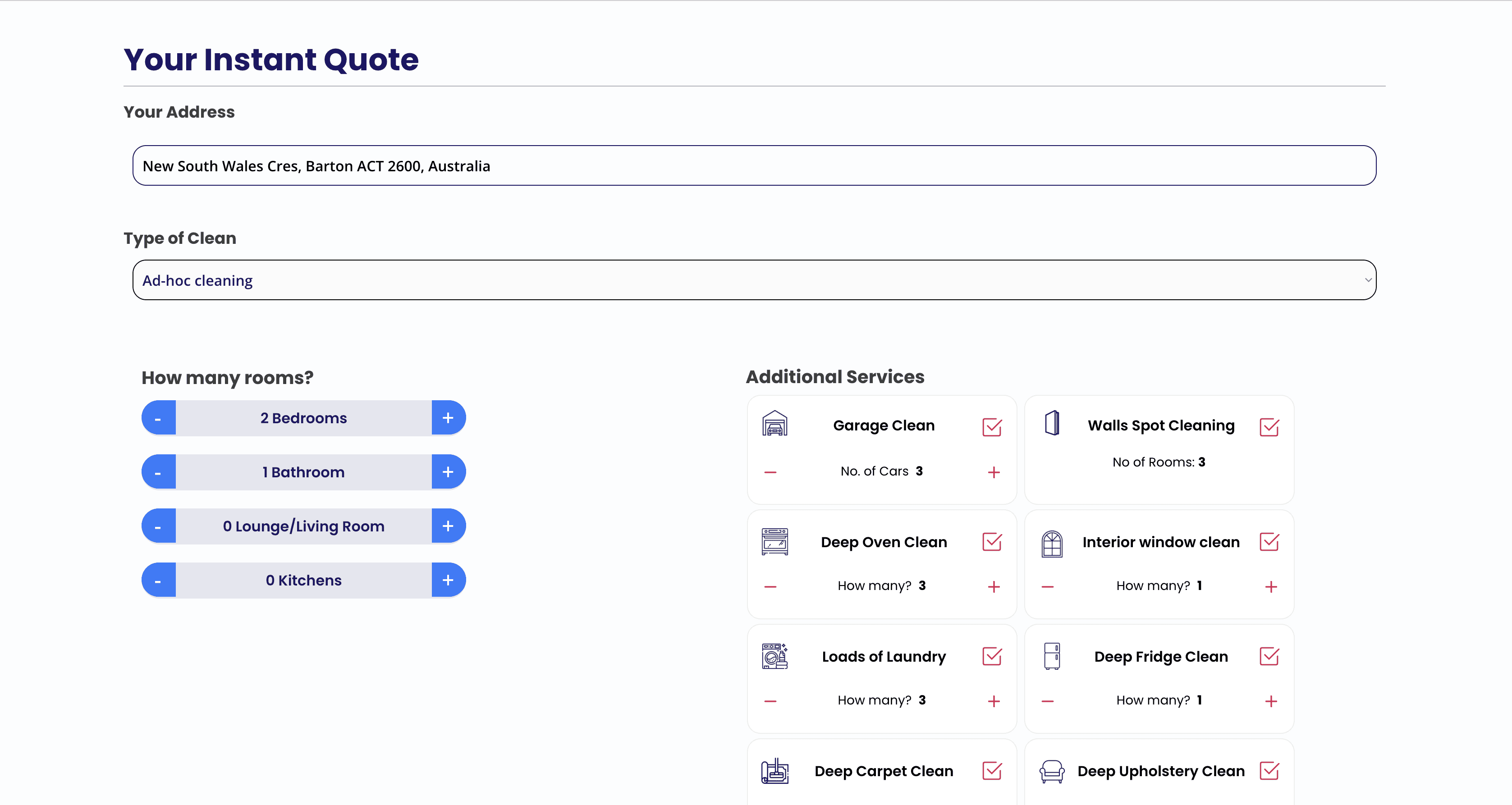 We developed a fully automated no-code platform that allowed users to: • Get real-time quotes based on their location, service type, and extras